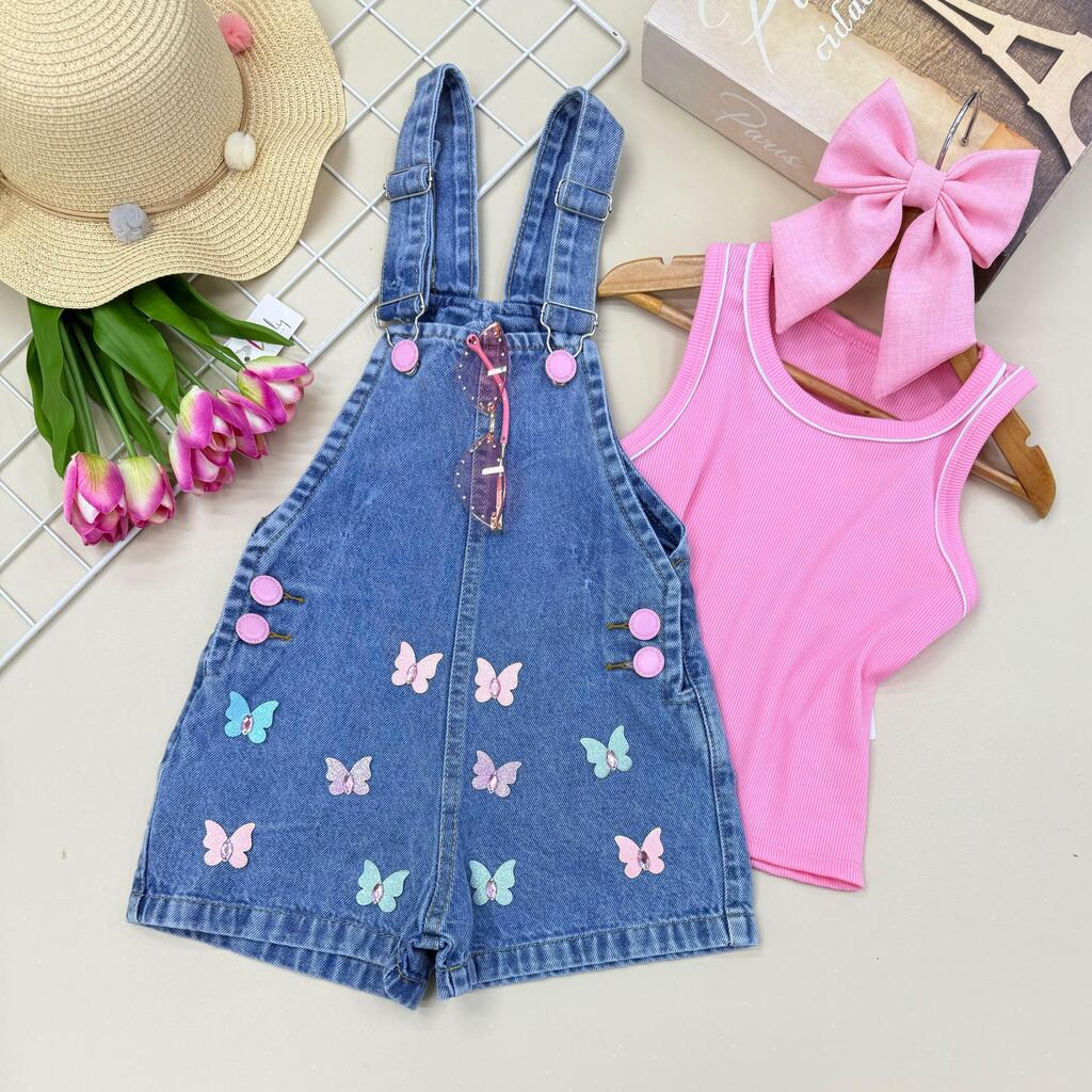Descrição: Cheia de charme e estilo, essa jardineira jeans infantil é perfeita para deixar o look das pequenas ainda mais encantador! Com um toque especial, a peça conta com um aplique de borboleta com brilho, que traz leveza, delicadeza e um ar mágico à produção.